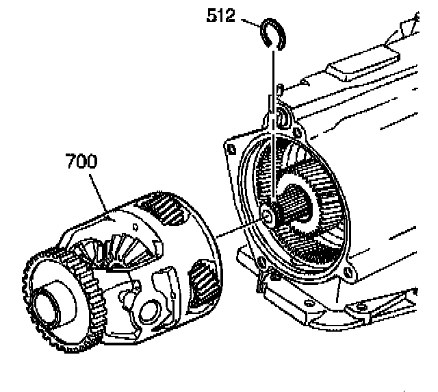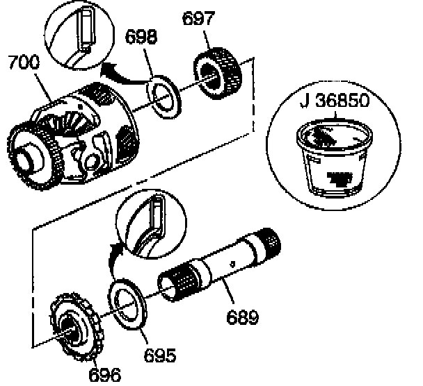 1. Assemble the sun gear thrust bearing (698), the differential carrier sun gear (697), the park gear (696), the internal gear thrust bearing (695) and the sun gear shaft (689) into the differential carrier (700).