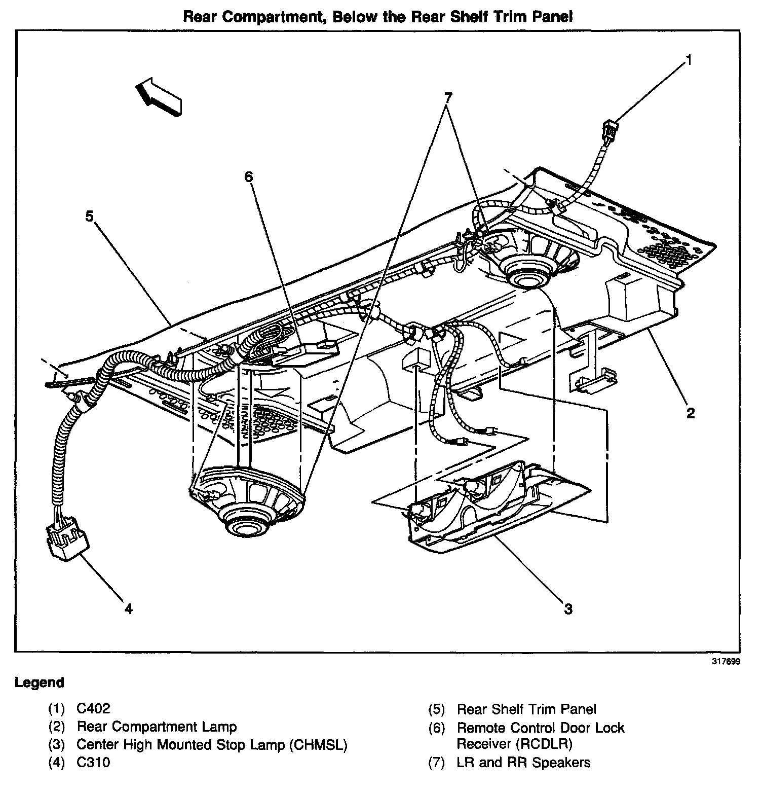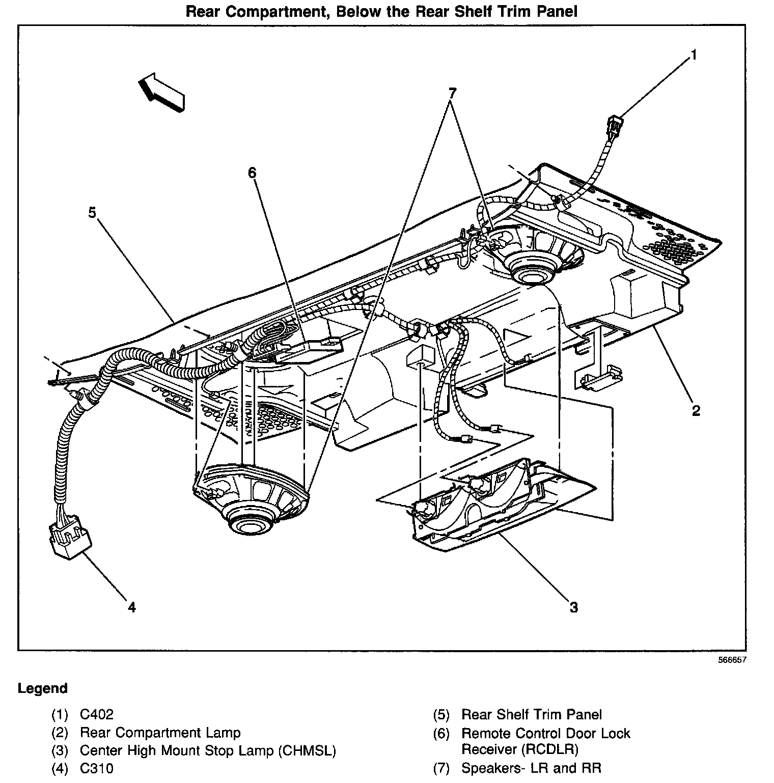 In the front of the rear compartment, under the rear shelf trim panel
