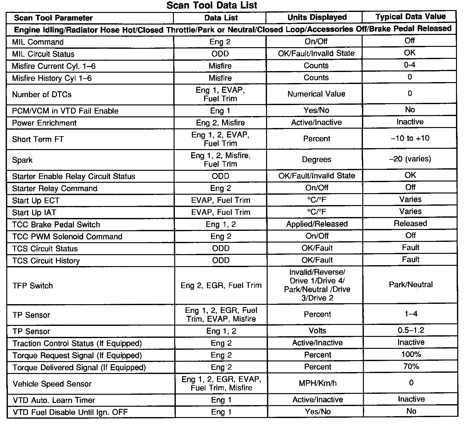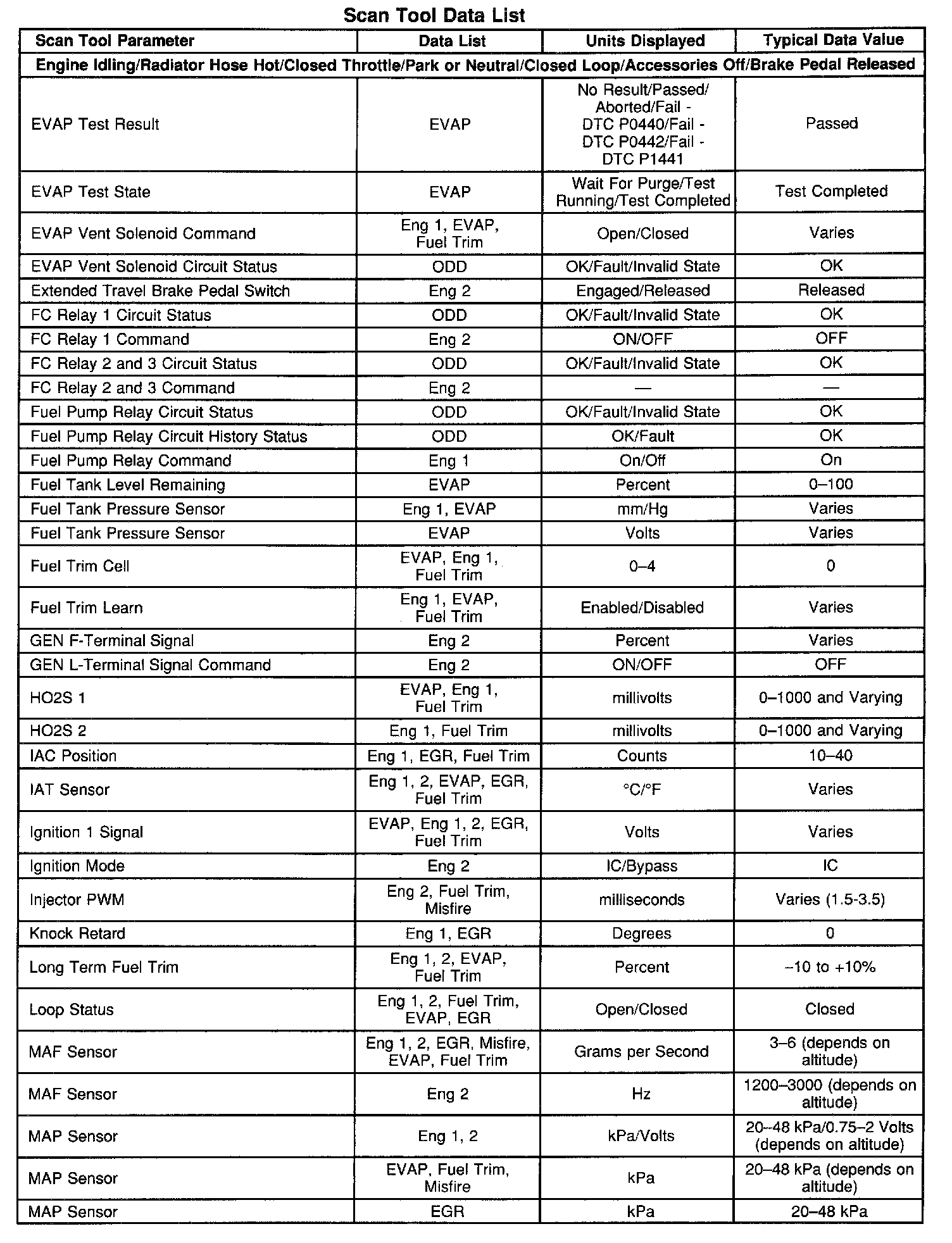 The Engine Scan Tool Data List contains all engine related parameters that are available on the scan tool. The list is arranged in alphabetical order. A given parameter may appear in any one of the data lists, and in some cases may appear more than once, or in more than one data list in order to group certain related parameters together.
