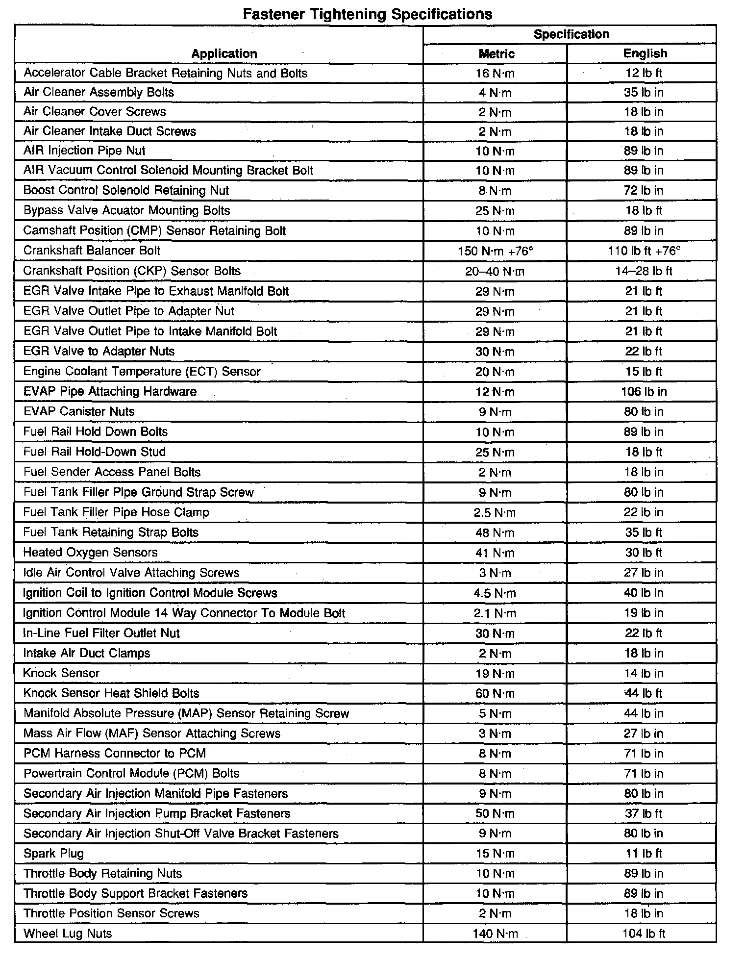 Fastener Tightening Specifications: