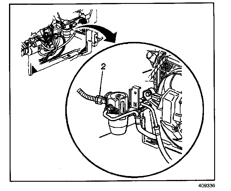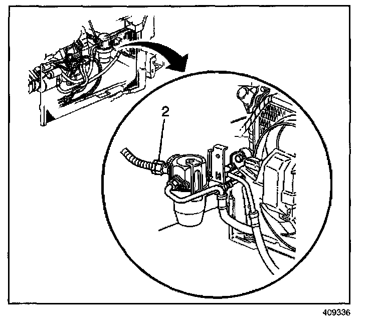 3. Loosen the accumulator hose nut (2) from the accumulator.