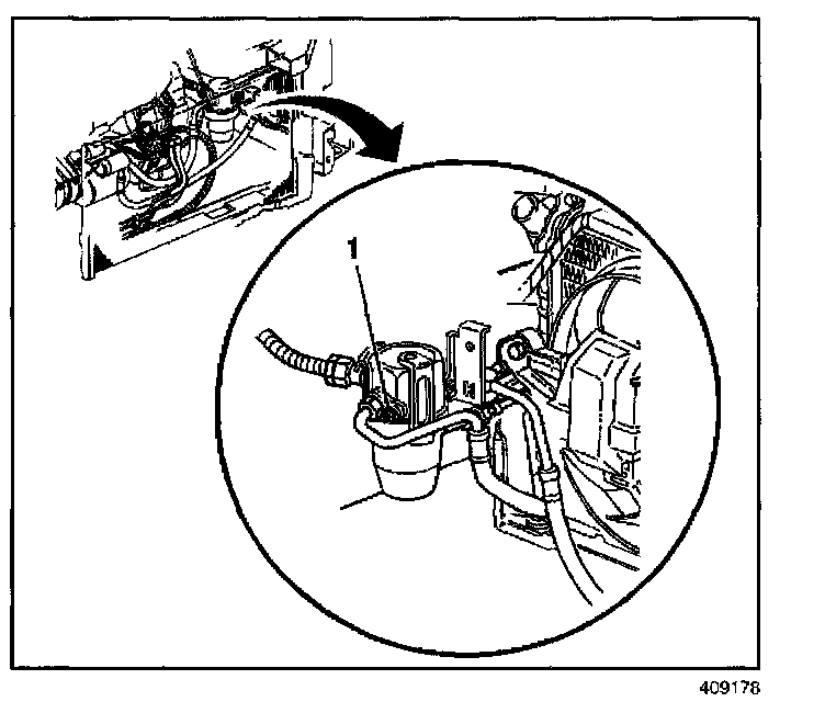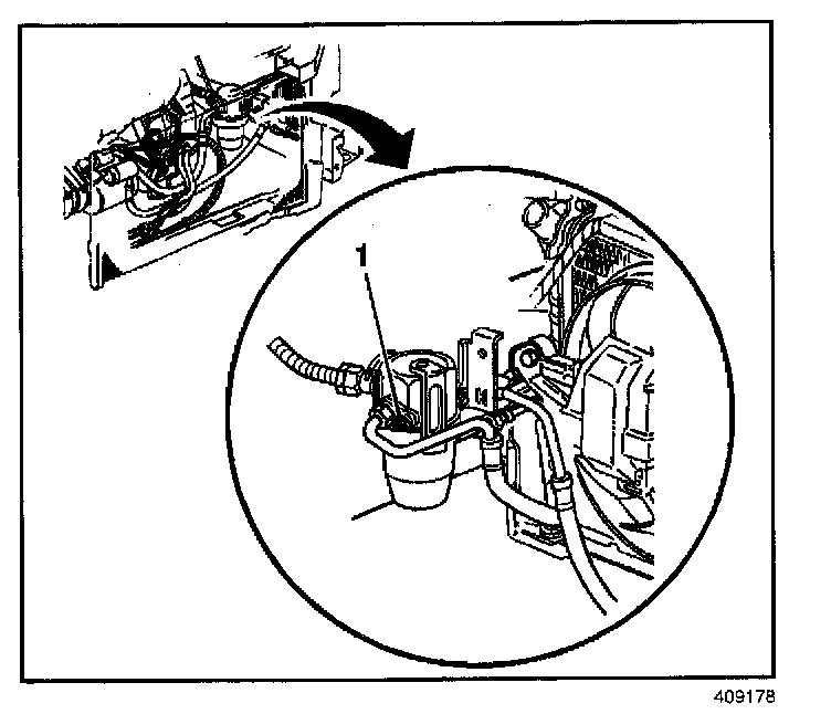 5. Remove the A/C compressor hose block fitting nut (1) from the accumulator.