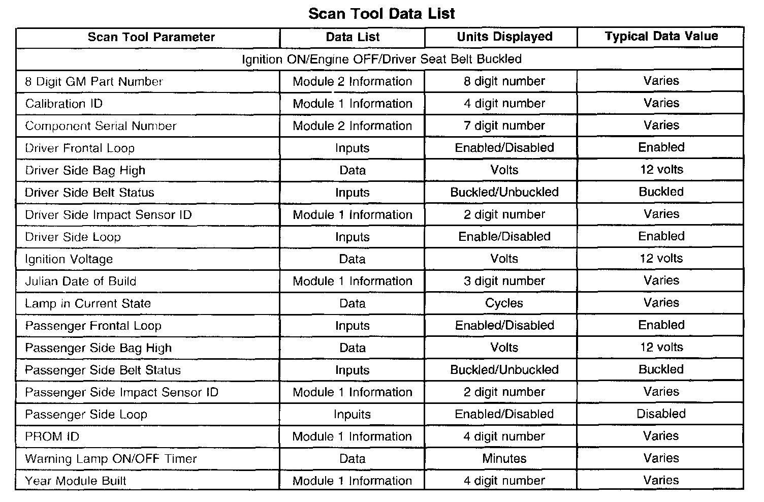 The SIR scan tool data list contains all the restraint system related parameters that are available on the scan tool. The parameters in the list are arranged in alphabetical order. The column, "Data List," indicates the location of the parameter within the scan tool menu selections.