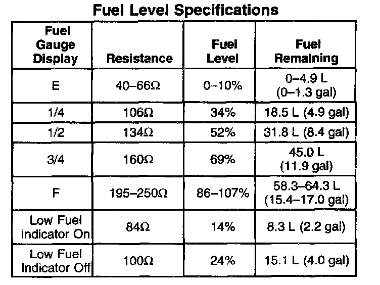 Fuel Level Specifications: