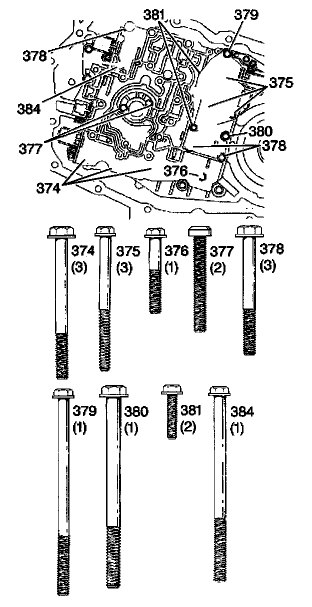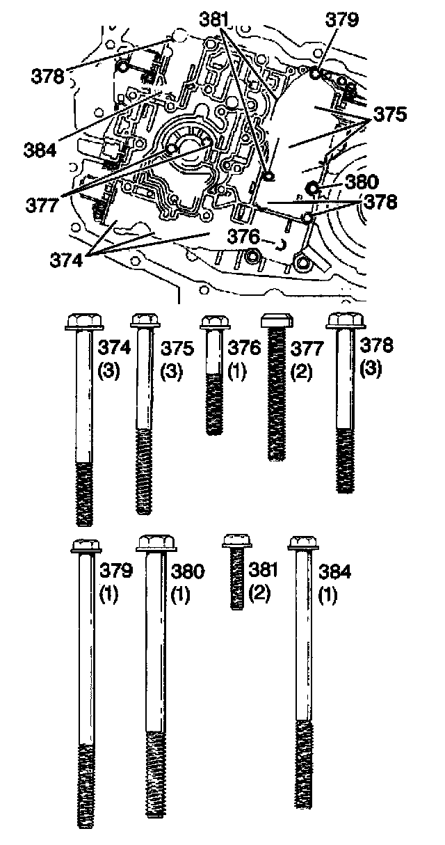 5. Install the valve body bolts (374-381 and 384).