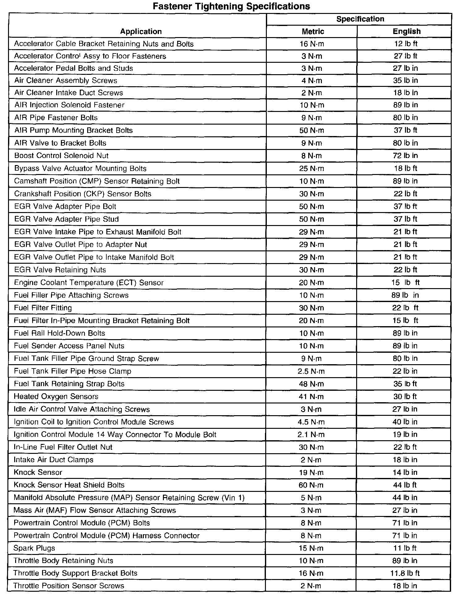 Fastener Tightening Specifications: