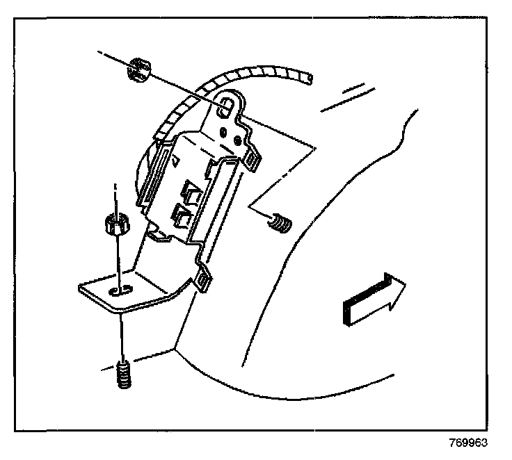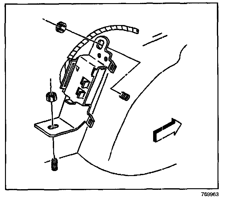 10. Slide the plastic bracket assembly inboard, under the metal bracket. Remove the plastic bracket assembly from the metal bracket.