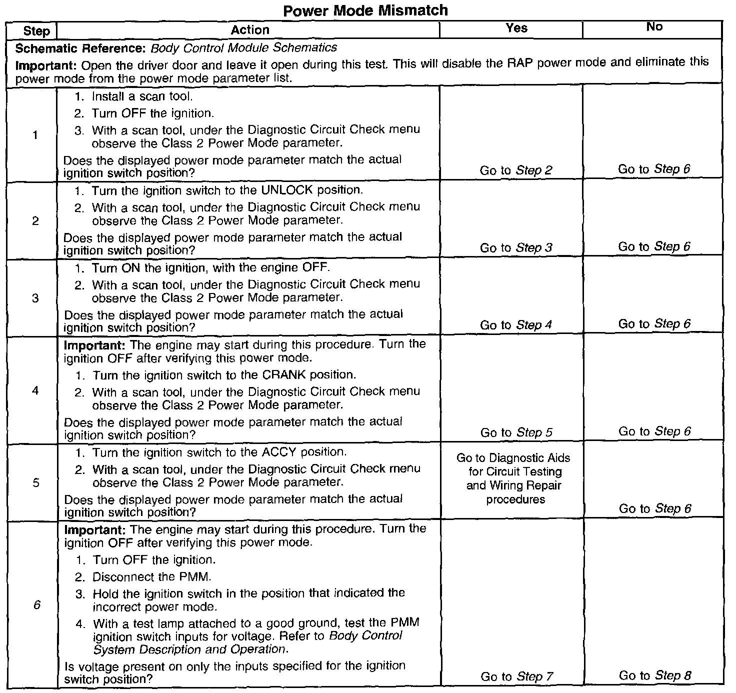 CIRCUIT DESCRIPTIONNormal vehicle class 2 communications and module operations will not begin until the system power mode has been identified. Discrete wires from the ignition switch contacts are monitored by the power mode master (PMM) module in order to determine the correct power mode. The PMM communicates the system power mode to all class 2 modules on the class 2 serial data line. Refer to Body Control System Description and Operation to identify which module is the PMM and the applicable power mode look up table.