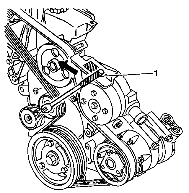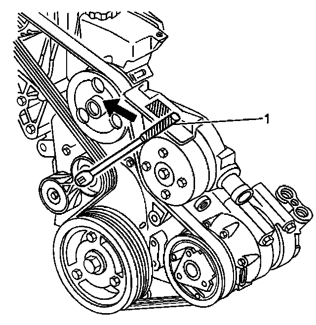 1. Remove the drive belt tension by lifting or rotating the drive belt tensioner off of the drive belt, using a 3/8-inch breaker bar (1).