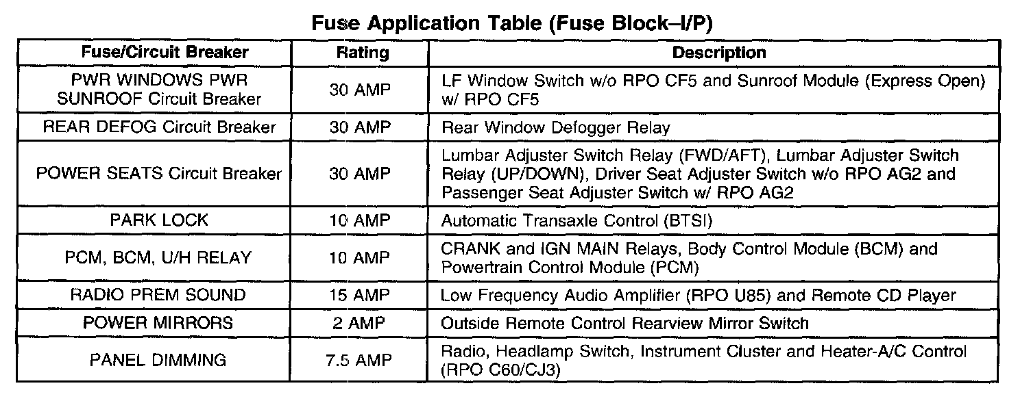 Fuse Application Table (Fuse Block - I/P) Part 1: