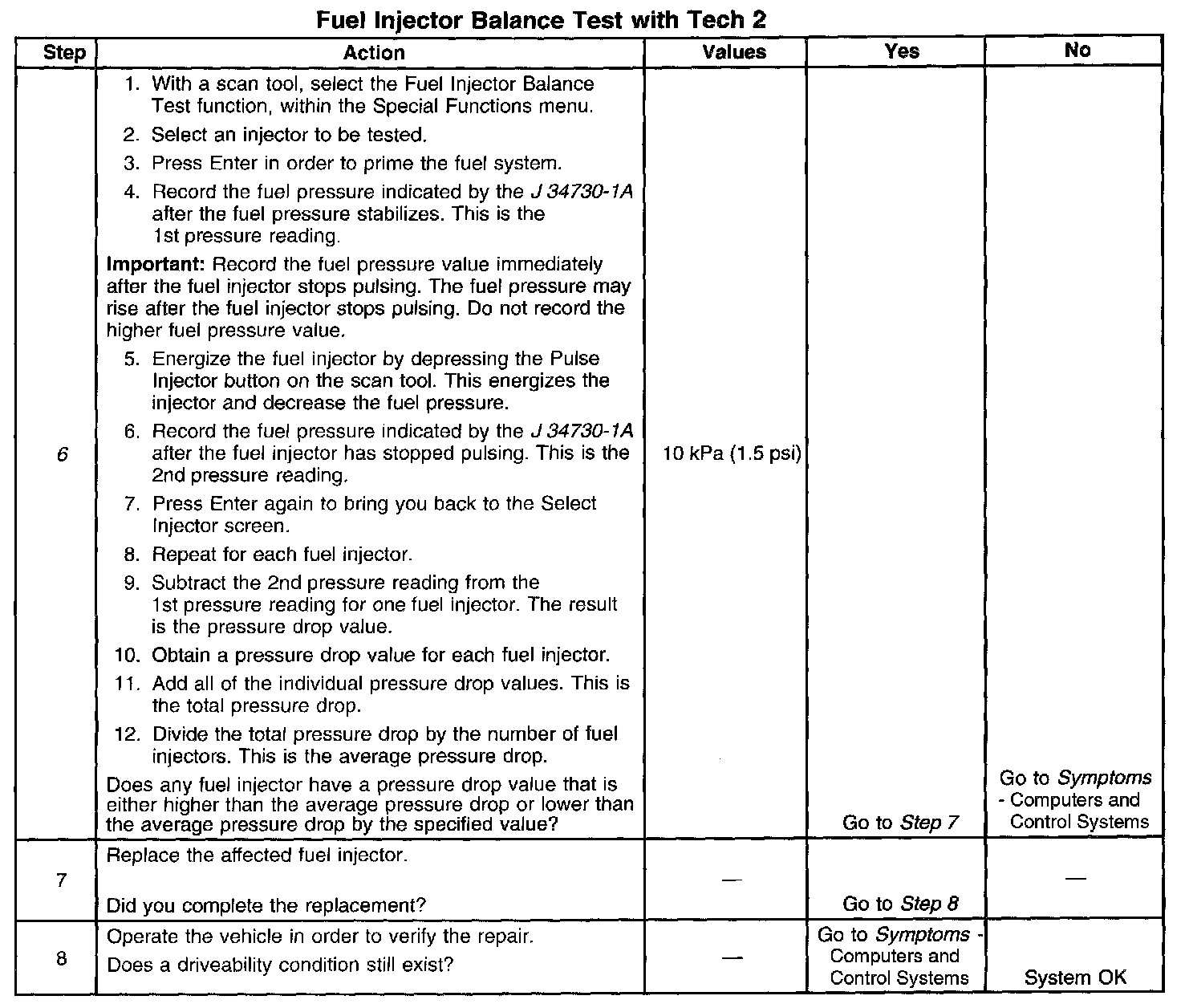 6. If the pressure drop value for each fuel injector is within 10 kPa (1.5 psi) of the average pressure drop value the fuel injectors are flowing properly. Calculate the pressure drop value for each fuel injector by subtracting the second pressure reading from the first pressure reading.