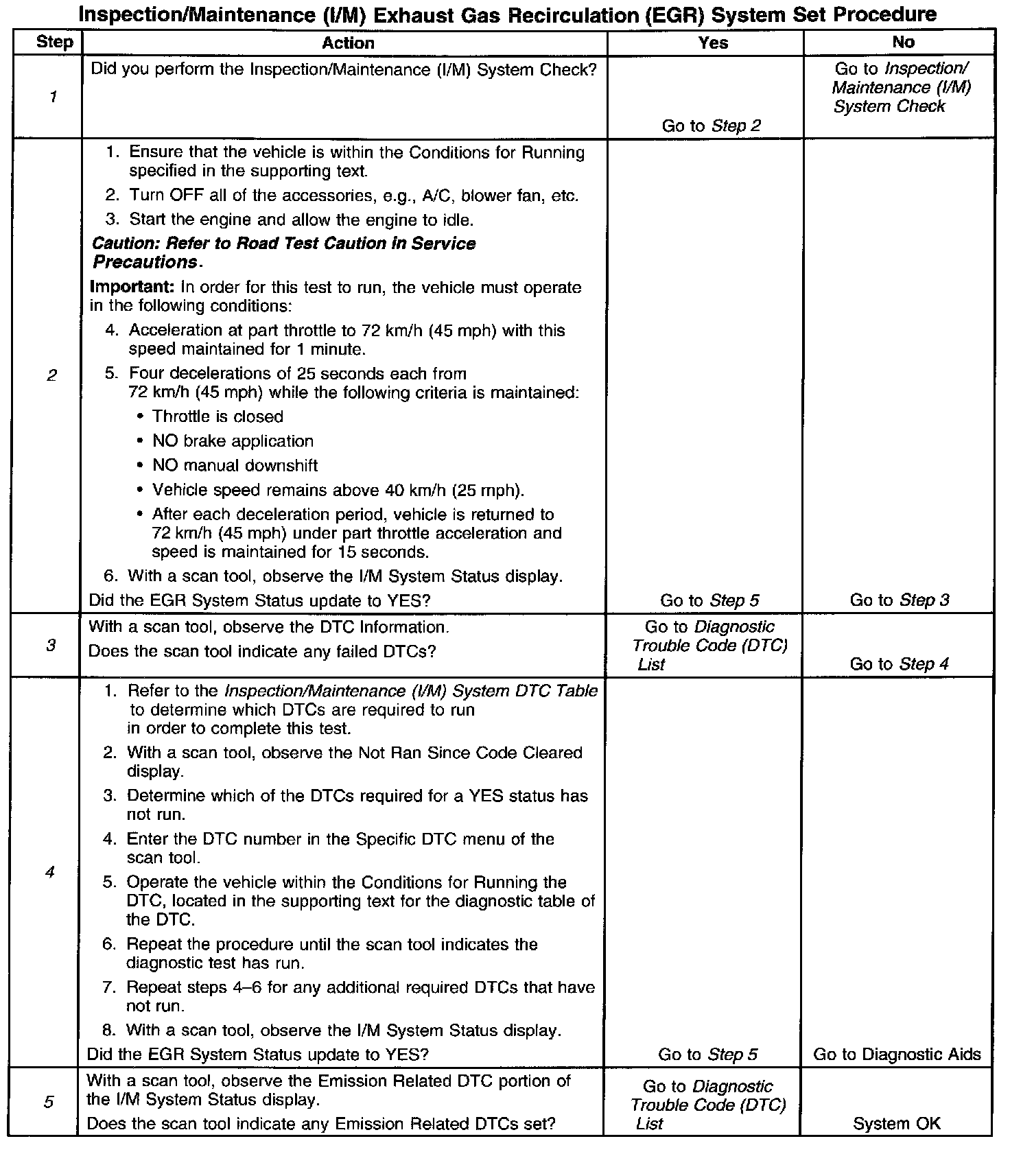 The control module only runs the EGR Active Tests during a gradual deceleration with a closed throttle and a vehicle speed above 40 km/h (25 mph). Several deceleration cycles may be necessary in order to accumulate a sufficient number of EGR flow samples. The procedure outlined in the table is for a clear, flat road. If the procedure is performed on a road with a slight down hill grade, the test may acquire the necessary sample counters in one or two decel trips. If the test is interrupted during the procedure, completing the test may take more than three deceleration cycles. If the status does not update, the test outlined in this procedure can be repeated until the I/M System Status updates to YES.