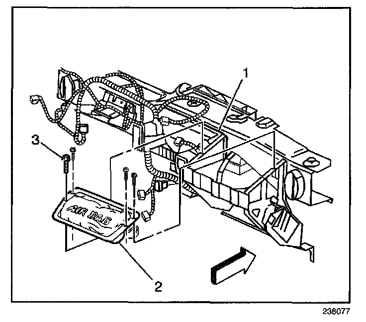 3. Remove the mounting fasteners (3) from the inflatable restraint I/P module.