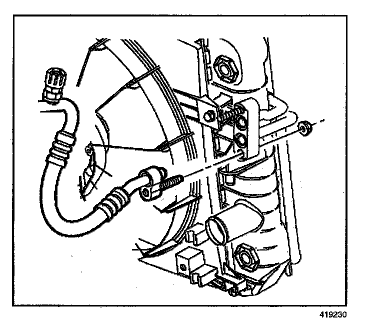 NOTE: The bolt retaining the condenser to the radiator end tank is a special length and should be the ONLY bolt used upon reinstallation. The use of a longer bolt will damage the radiator end tank.