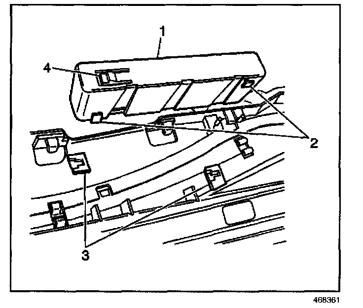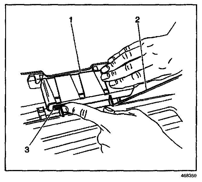2. Install the sunroof express module tabs (2) into the sunroof module slots (3) located on the sunroof module.