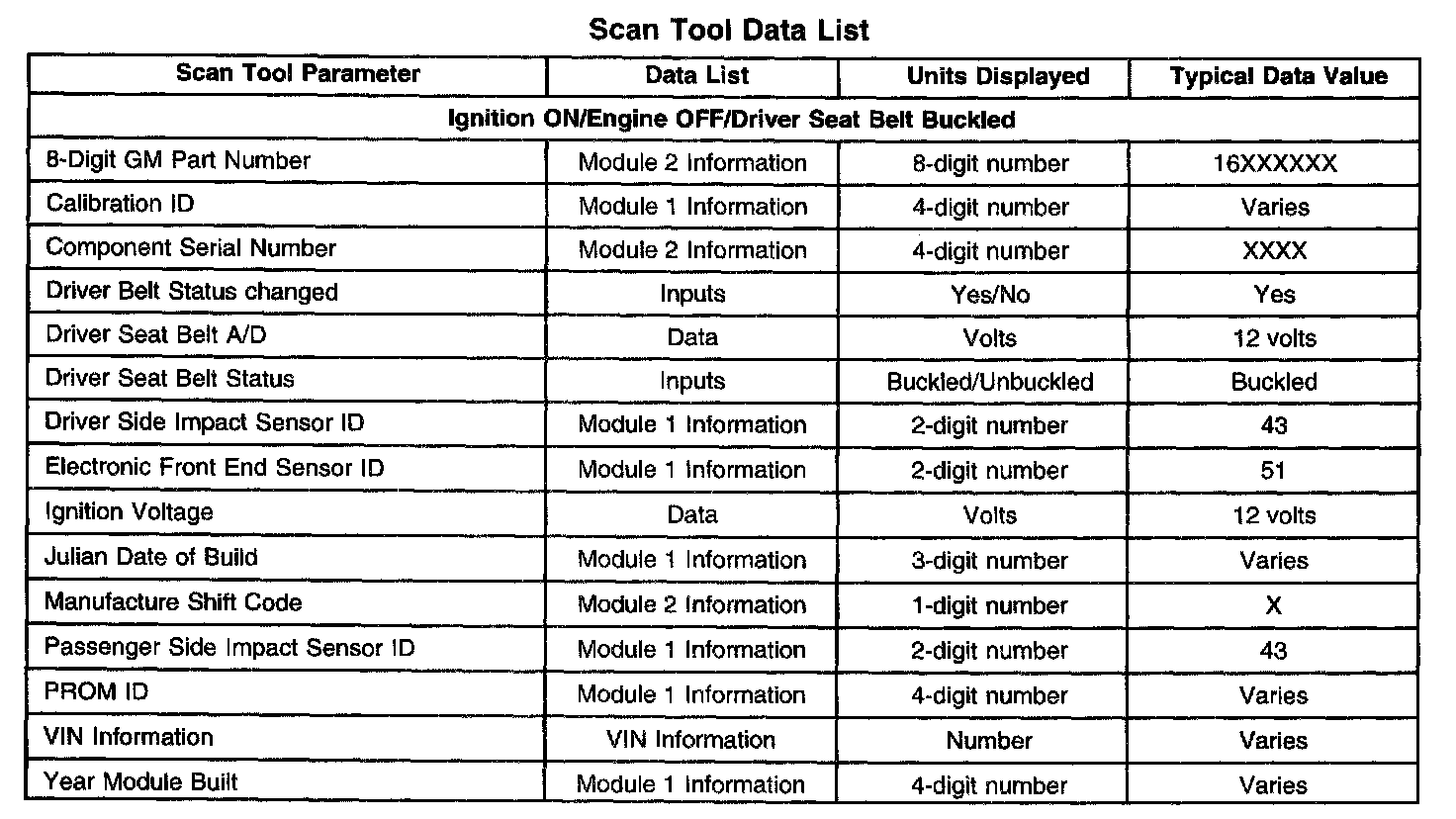 The SIR Scan Tool Data List contains all the restraint system related parameters that are available on the scan tool. The parameters in the list are arranged in alphabetical order. The column, "Data List," indicates the location of the parameter within the scan tool menu selections.