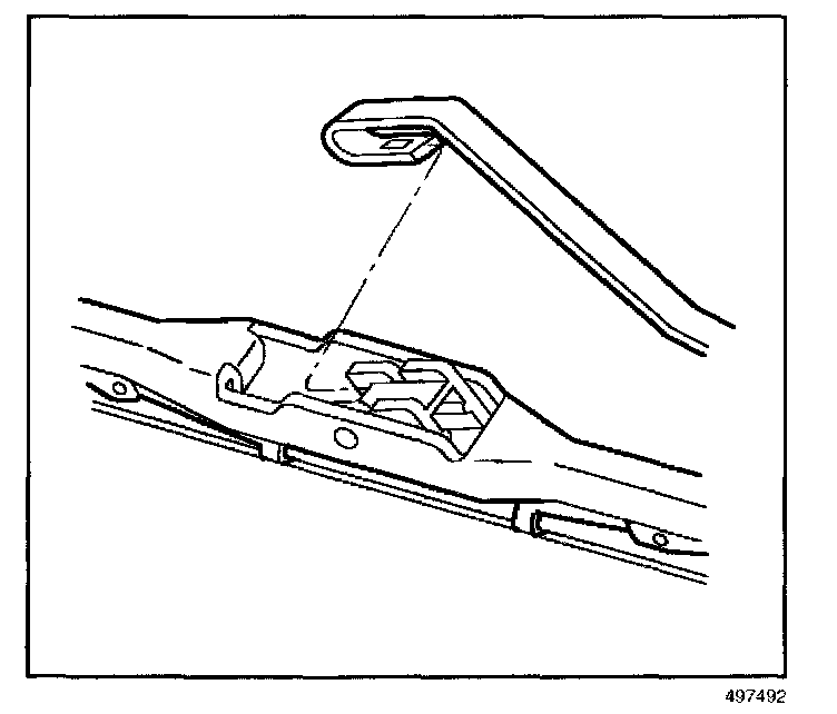 1. Install the wiper blade onto the arm by placing the arm hook through the opening in the wiperblade. Slide the arm hook onto the blade retaining clip until it clicks into position.