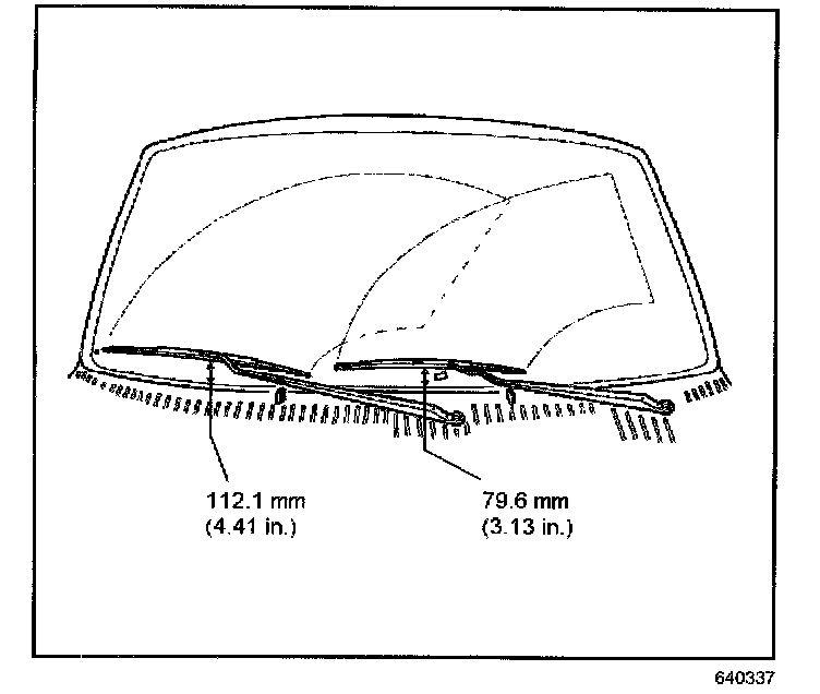 3. Install the wiper arm Onto the pivot shaft while aligning the wiper blade with the locating marks on the windshield. If the windshield does not have locating marks, locate the center of the blades to the distance shown up from the base of the windshield.