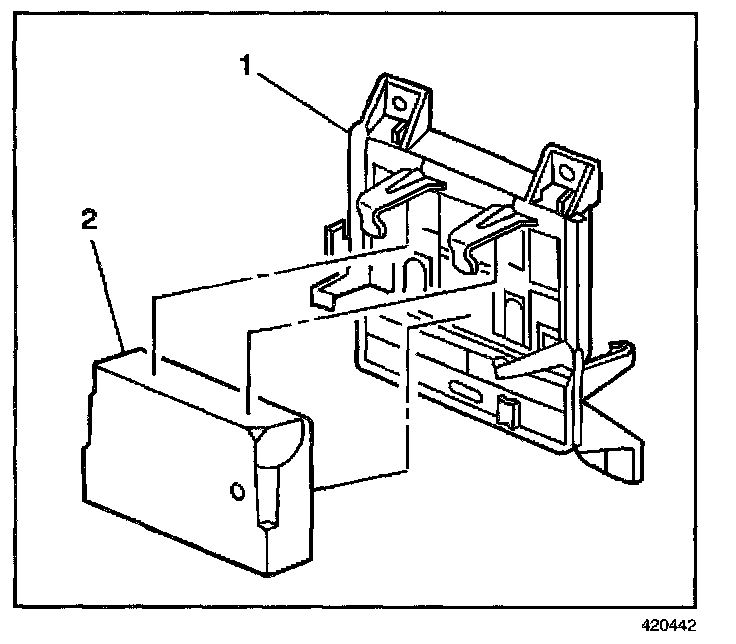 2. Remove the body control module (2). Spread the latch tabs on the sides of the bracket (1) while pulling downward, remove from mounting bracket.