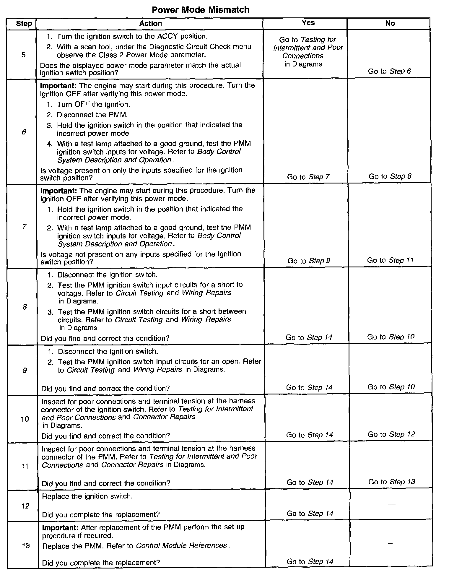 CIRCUIT DESCRIPTIONNormal vehicle class 2 communications and module operations will not begin until the system power mode has been identified. Discrete wires from the ignition switch contacts are monitored by the power mode master (PMM) module in order to determine the correct power mode. The PMM communicates the system power mode to all class 2 modules on the class 2 serial data line. Refer to Body Control System Description and Operation to identify which module is the PMM and the applicable power mode look up table.