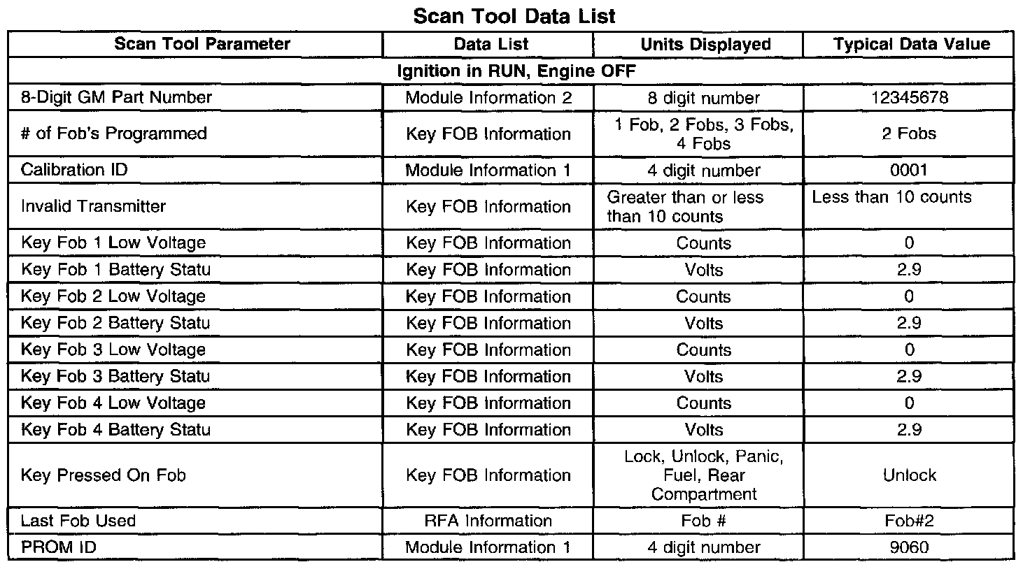 The Keyless Entry Scan Tool Data List contains all of the keyless entry related parameters that are available on the scan tool. The parameters in the list are arranged in alphabetical order. The column, "Data List," indicates the location of the parameter within the scan tool menu selections. Use the keyless Entry Scan Tool Data List as directed by a diagnostic table or in order to supplement the diagnostic procedures. Begin all of the diagnostic procedures with Diagnostic System Check - Remote Keyless Entry.