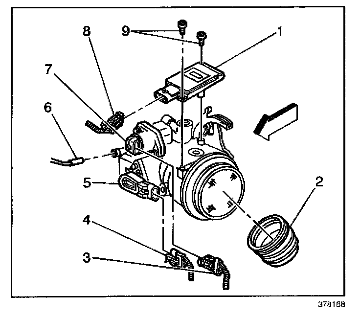 4. Remove the screws (9) that hold the MAF sensor to the throttle body.