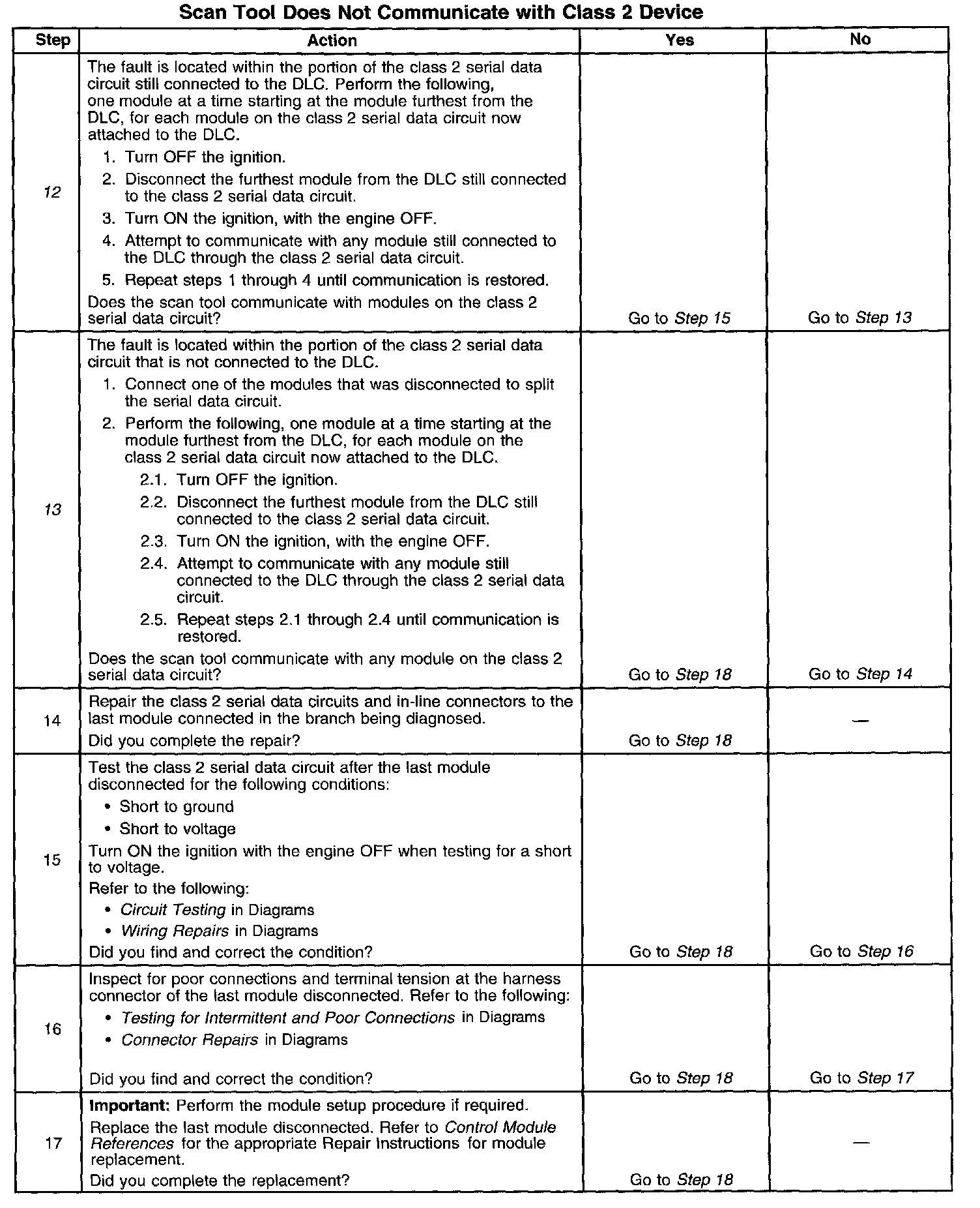 13. Splitting the class 2 serial data circuit will help isolate the location of the malfunction. If communication can be established, the malfunction is located in the wiring or one of the modules that is no longer connected to the DLC. If communication cannot be established, the malfunction is located in the wiring or one of the modules that is still connected to the DLC.