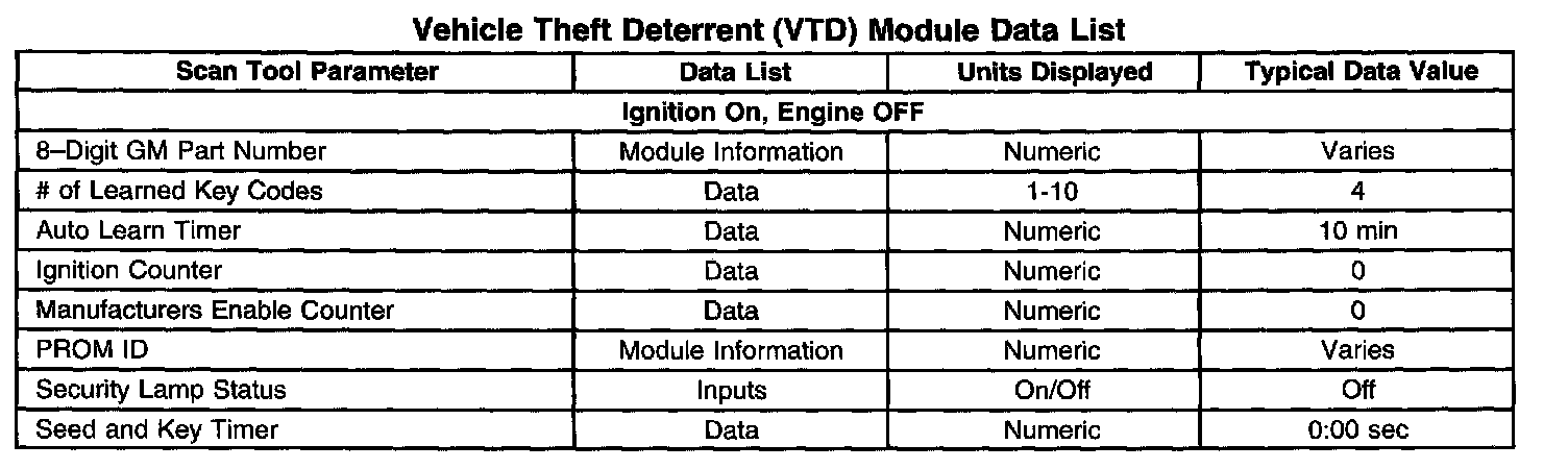 Vehicle Theft Deterrent (VTD) Module Data List:
