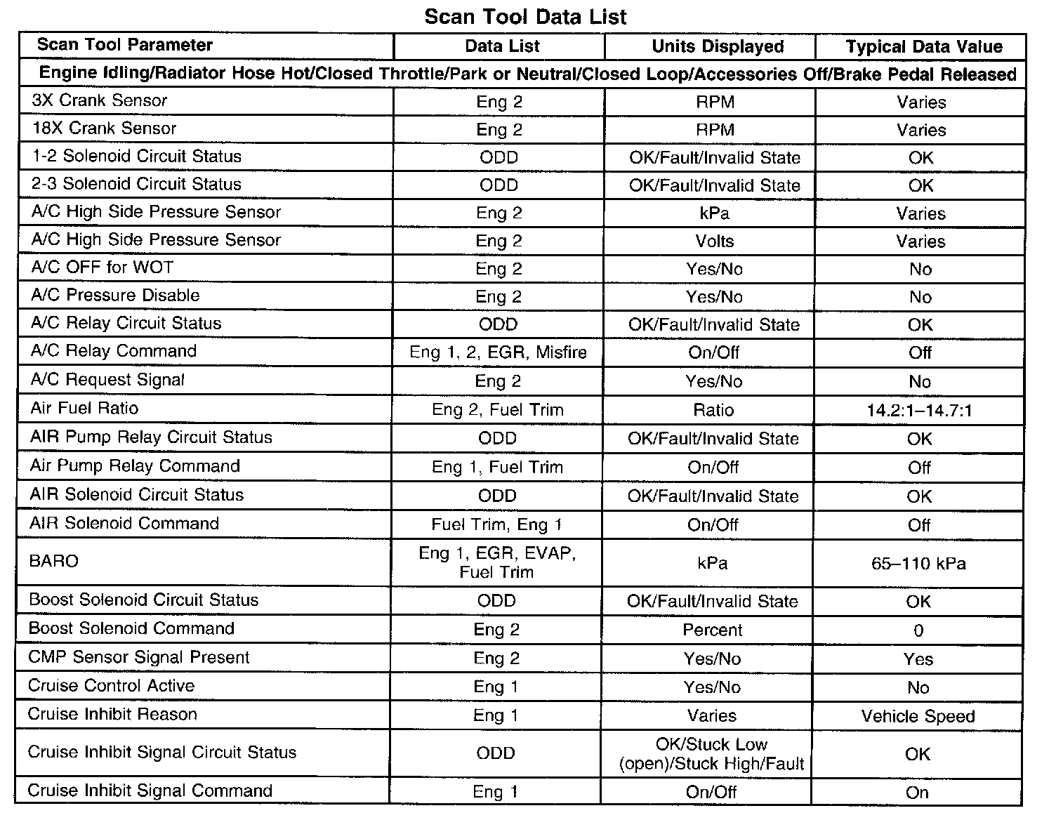 The Engine Scan Tool Data List contains all engine related parameters that are available on the scan tool. The list is arranged in alphabetical order. A given parameter may appear in any one of the data lists, and in some cases may appear more than once, or in more than one data list in order to group certain related parameters together.