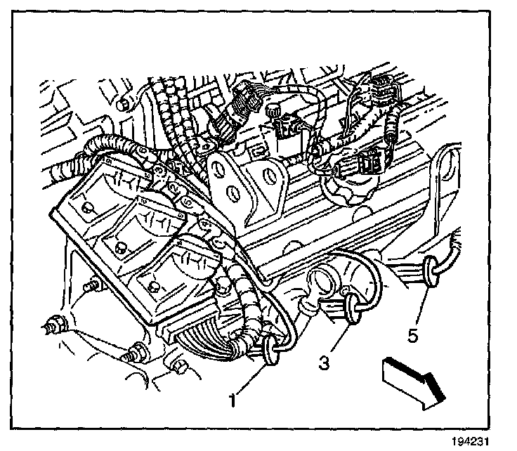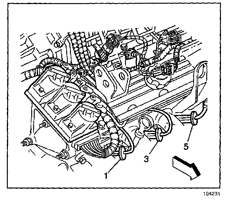 4. Remove the spark plug wires (1, 3, 5) from the spark plugs at the front of the engine using the following steps: