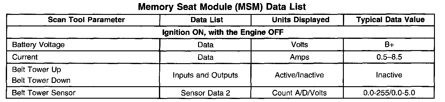 Memory Seat Module (MSM) Data List: