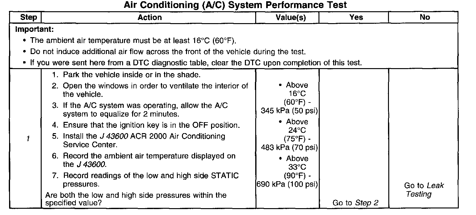 1. This step determines if the A/C system has at least the minimum refrigerant charge required to operate the system without damage.