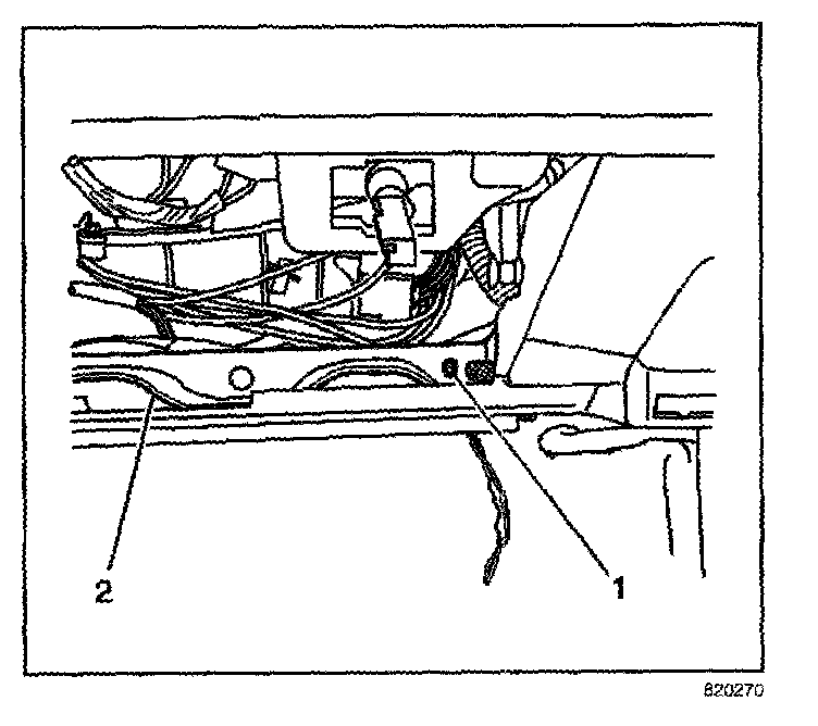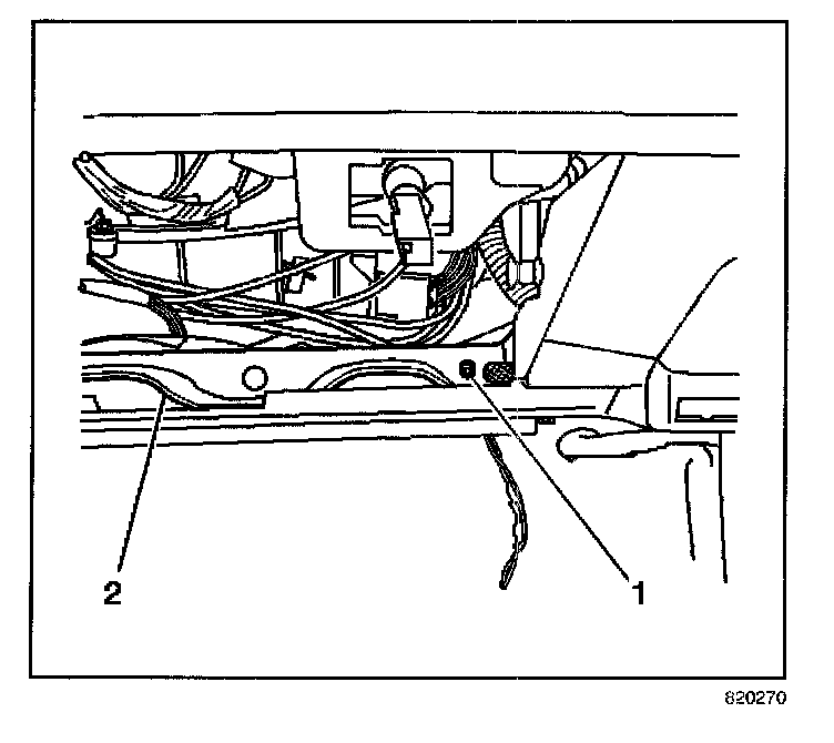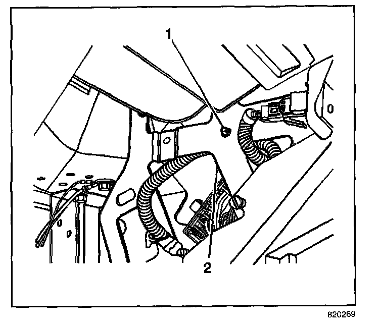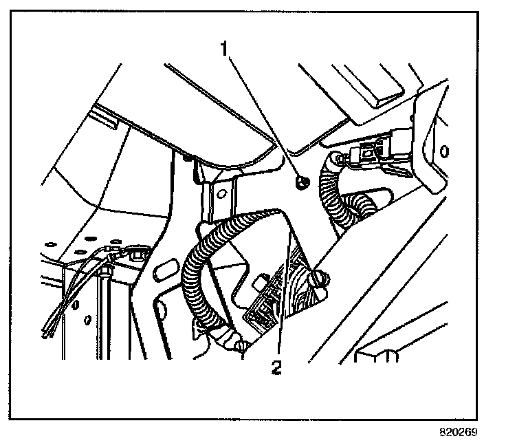 5. Install the lamp harness retainer (1) to the passenger knee bolster bracket (2).