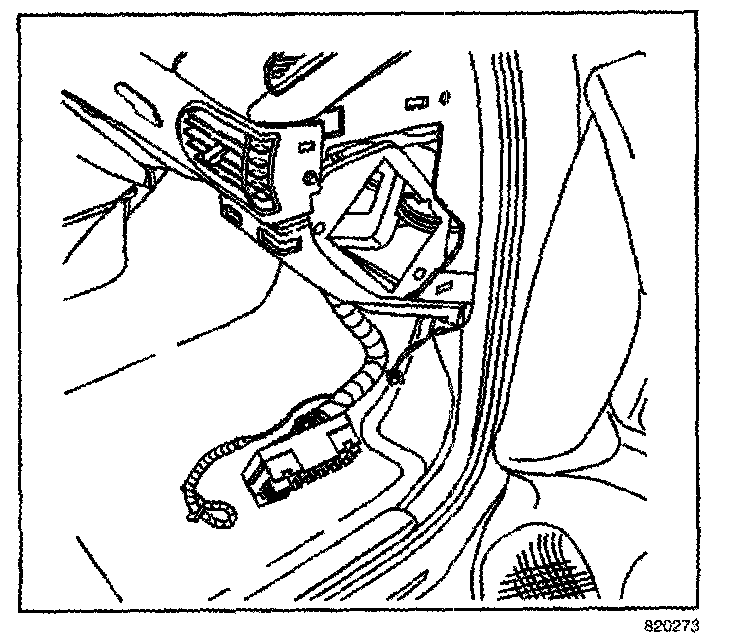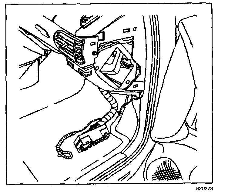 5. Remove the lamp harness retainer (1) from the passenger knee bolster bracket (2).
