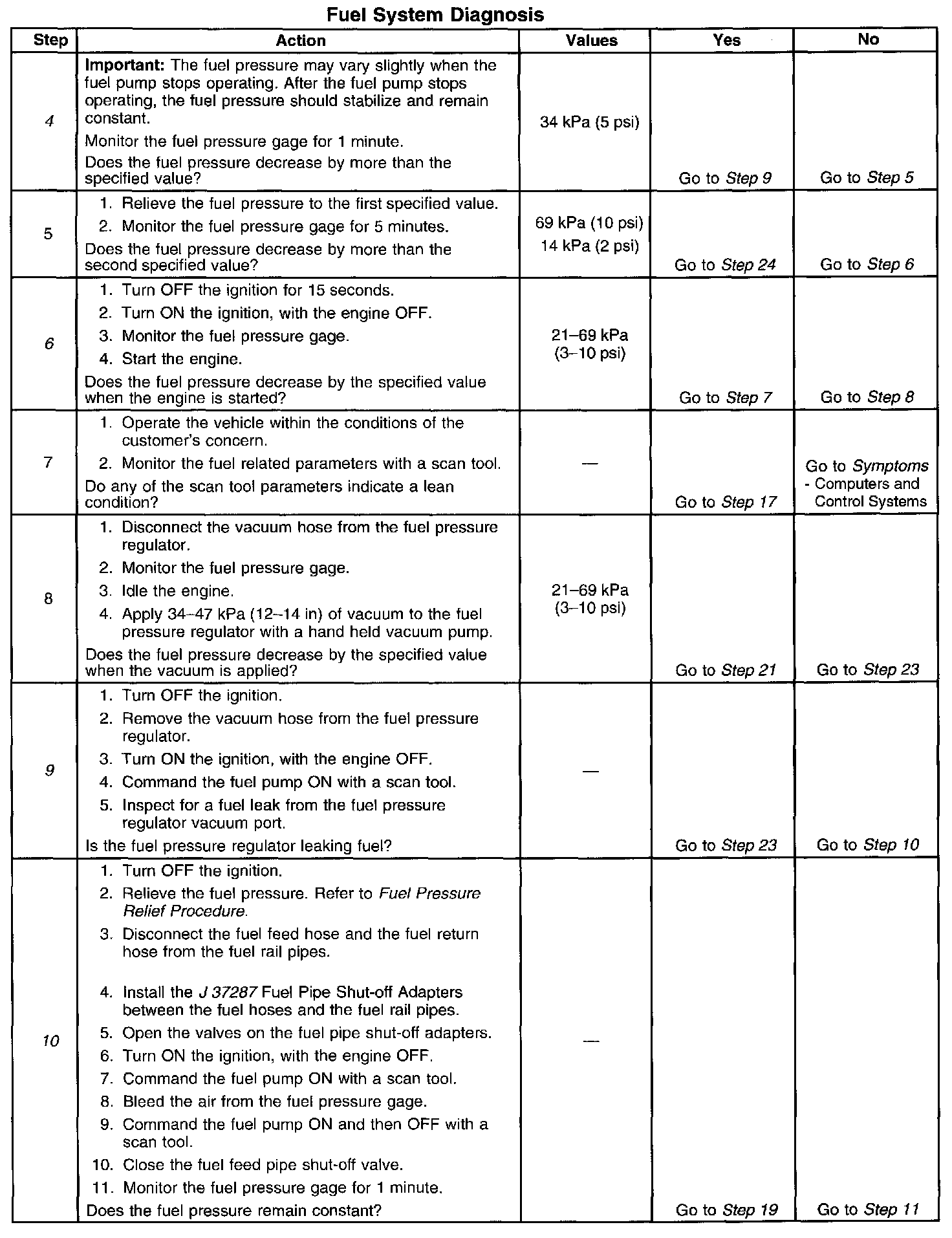 4. This step tests for an internal fuel leak. If the fuel pressure decreases during this test, an internal loss of pressure is indicated.