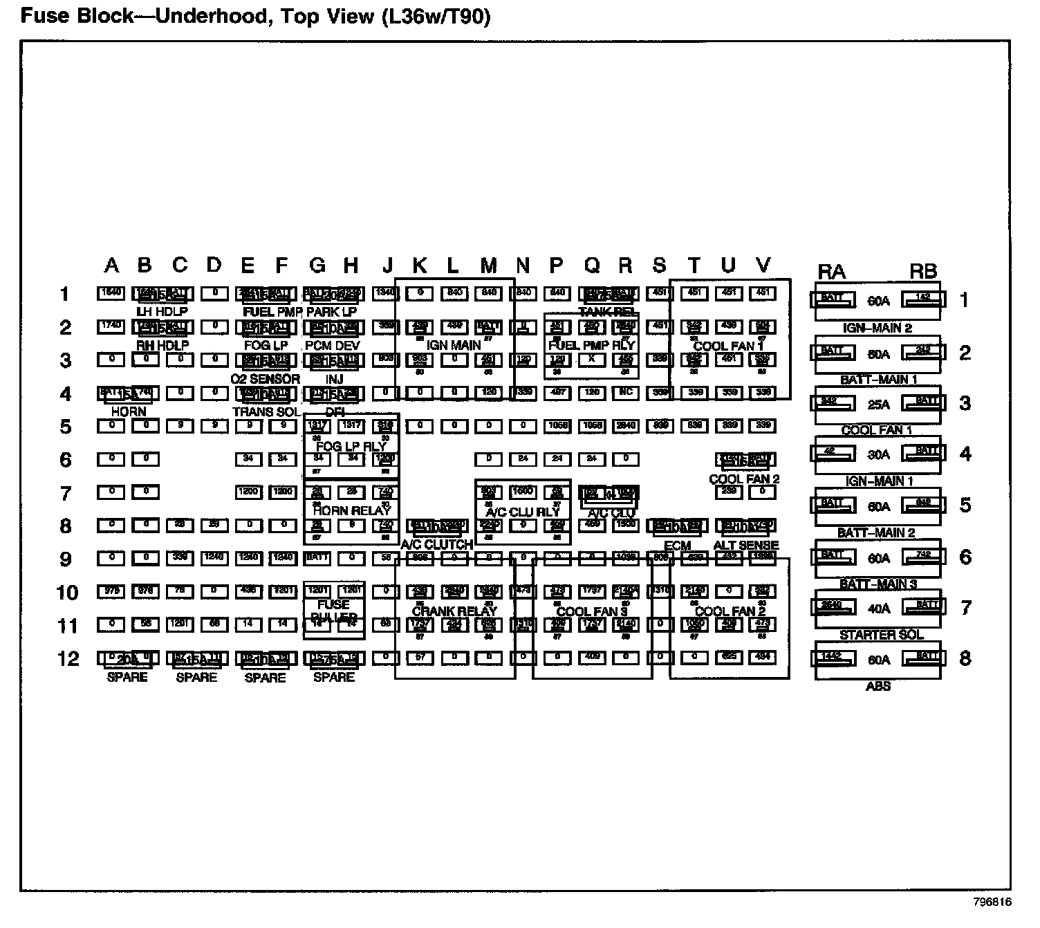Fuse Block - Underhood, Top View (L36 W/T90):