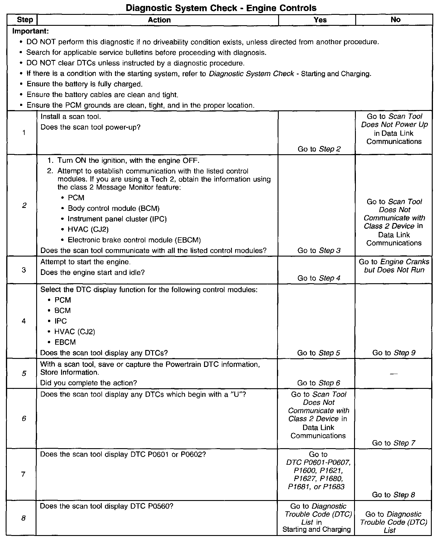 DESCRIPTIONThe Diagnostic System Check is an organized approach to identifying a condition created by an electronic engine control system malfunction. The Diagnostic System Check must be the starting point for any driveability concern. The Diagnostic System Check directs the service technician to the next logical step in diagnosing the concern. Understanding the table and using the table correctly reduces diagnostic time and prevents the replacement of good parts.