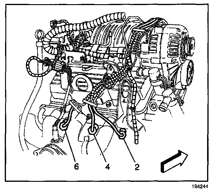 5. Install the spark plug wires (2, 4, 6) to the spark plugs in the proper position at the rear of the engine.