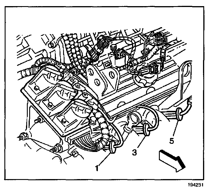 4. Remove the spark plug wires (1, 3, 5) from the spark plugs at the front of the engine using the following steps: