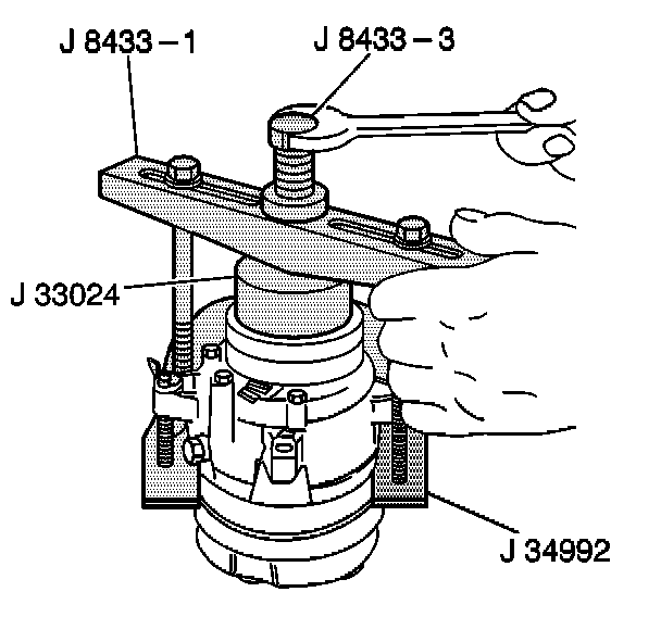 16. Tighten the J 8433-3 in the J 8433-1 in order to force the pulley rotor and bearing assembly onto the front head of the compressor.