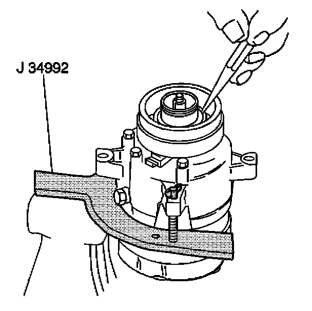 8. With the compressor still mounted to the J 34992 and the coil seated on the front head, stake the front head using a drift punch with a diameter of 3.175 mm (0.125 in).