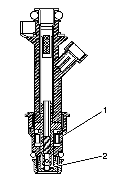 The Multec 2 fuel injector assembly is a solenoid operated device, controlled by the PCM, that meters pressurized fuel to a single engine cylinder. The PCM energizes the high-impedance (12 ohms) injector solenoid (2) to open a normally closed ball valve (3). This allows fuel to flow into the top of the injector, past the ball valve, and through a director plate at the injector outlet. The director plate has four machined holes that control the fuel flow, generating a spray of finely atomized fuel at the injector tip. Fuel from the injector tip is directed at the intake valve, causing the fuel to become further atomized and vaporized before entering the combustion chamber. An injector stuck partly open can cause a loss of pressure after engine shutdown. Consequently, long cranking times would be noticed on some engines.