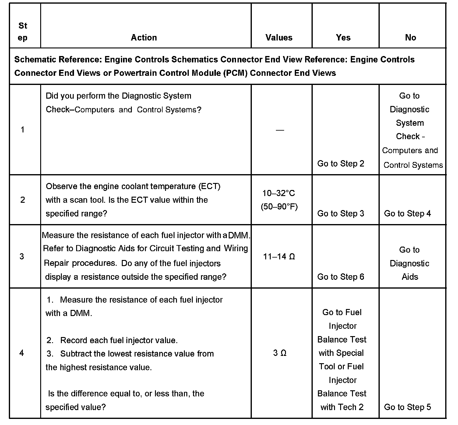 - If the fuel injector coil test does not isolate the condition perform the fuel injector balance test. Refer to Fuel Injector Balance Test with Special Tool or Fuel Injector Balance Test with Tech 2. Component Tests and General Diagnostics Component Tests and General Diagnostics