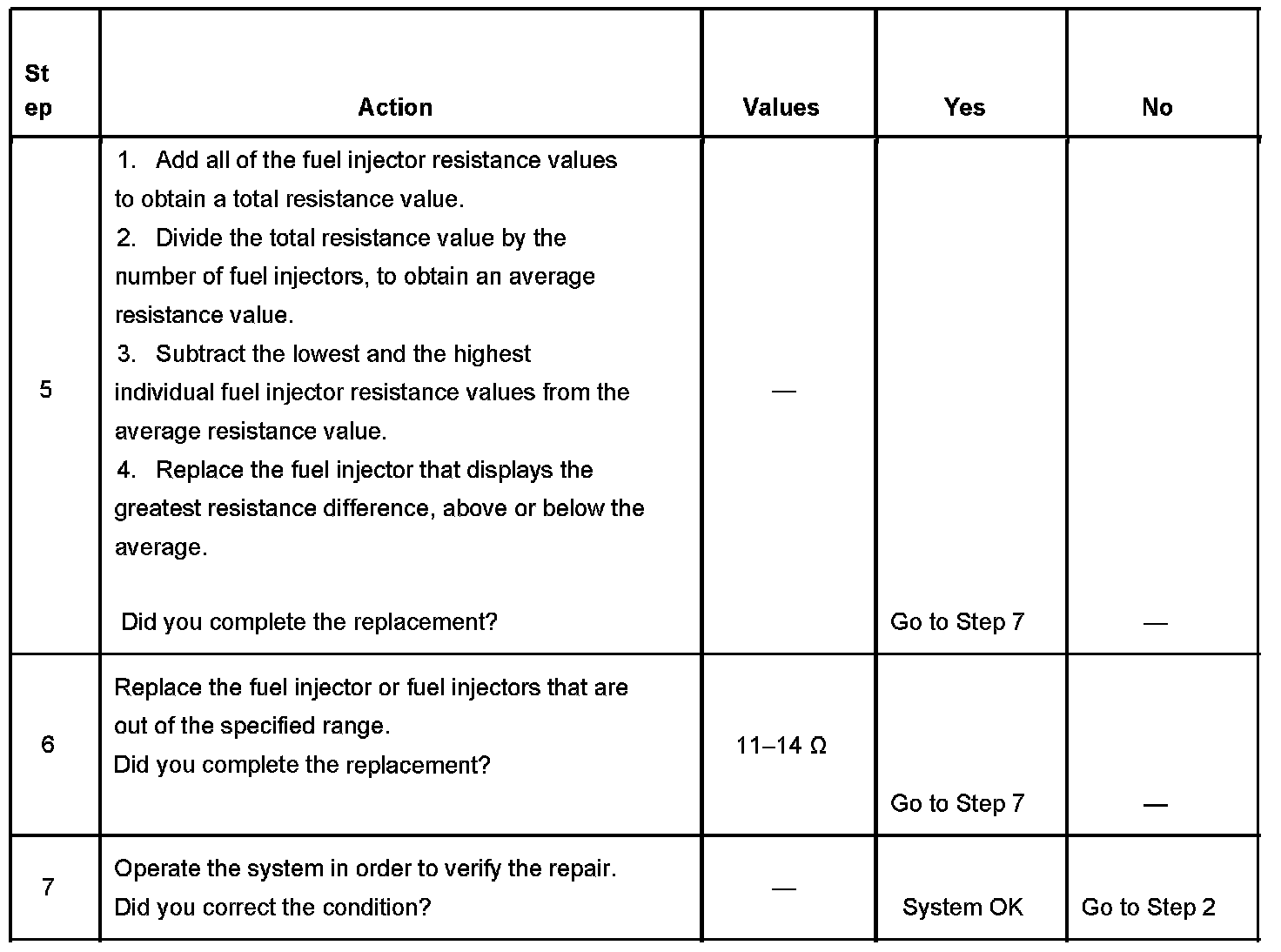 3. This step tests each fuel injector resistance within a specific temperature range. If any of the fuel injectors display a resistance outside of the specified value, replace the fuel injector.