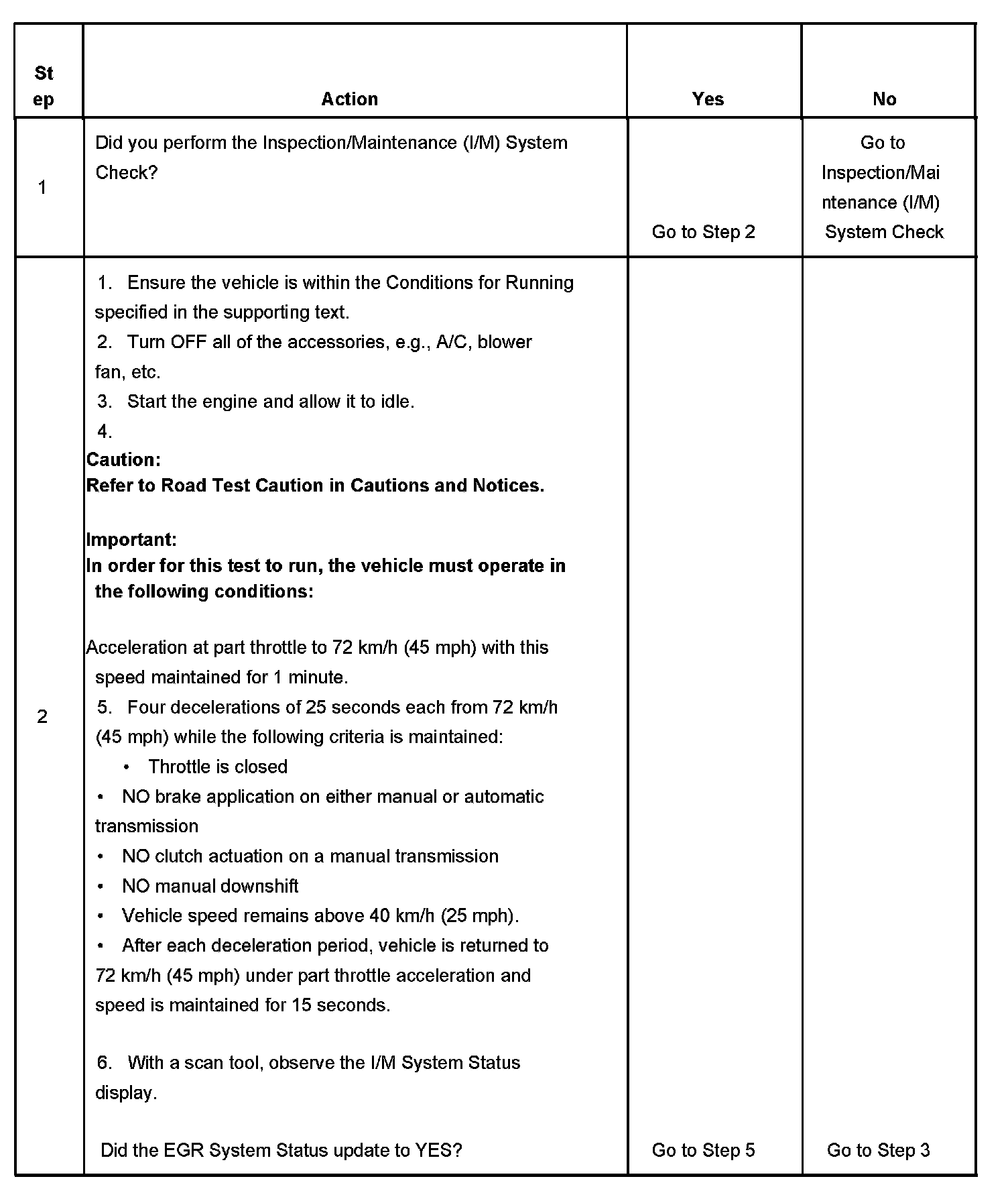 The control module only runs the EGR Active Tests during a gradual deceleration with a closed throttle and a vehicle speed above 40 km/h (25 mph). Several deceleration cycles may be necessary in order to accumulate a sufficient number of EGR flow samples. The procedure outlined in the table is for a clear, flat road. If the procedure is performed on a road with a slight down hill grade, the test may acquire the necessary sample counters in one or two decel trips. If the test is interrupted during the procedure, completing the test may take more than three deceleration cycles. If the status does not update, the test outlined in this procedure can be repeated until the I/M System Status updates to YES.