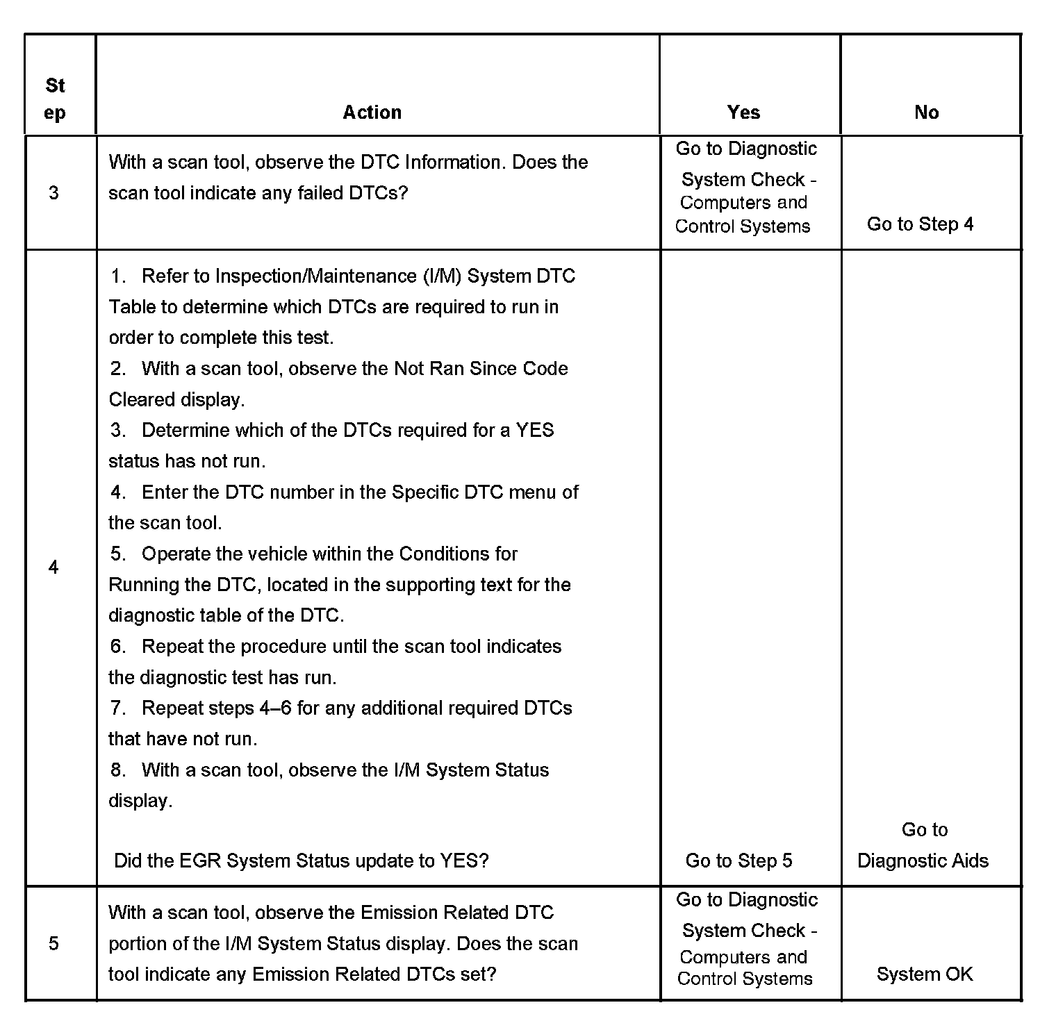 3. This step is to identify a first failure of a type B DTC. A DTC only appears on the I/M System Status display when it becomes a malfunction indicator lamp (MIL) illuminating DTC. This occurs on the second failure of a type B DTC. A first failure of a type B DTC will not allow the I/M System Status to update to YES. Refer to Diagnostic Aids.