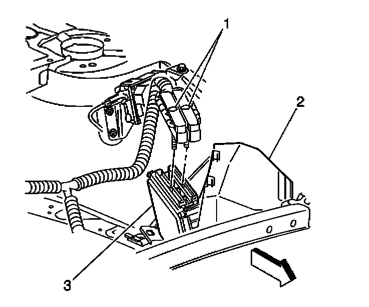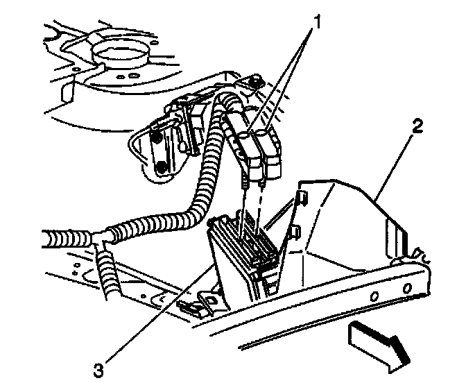 6. Without disconnecting the PCM connectors (1), remove the PCM (3) and harness from the PCM housing (2).