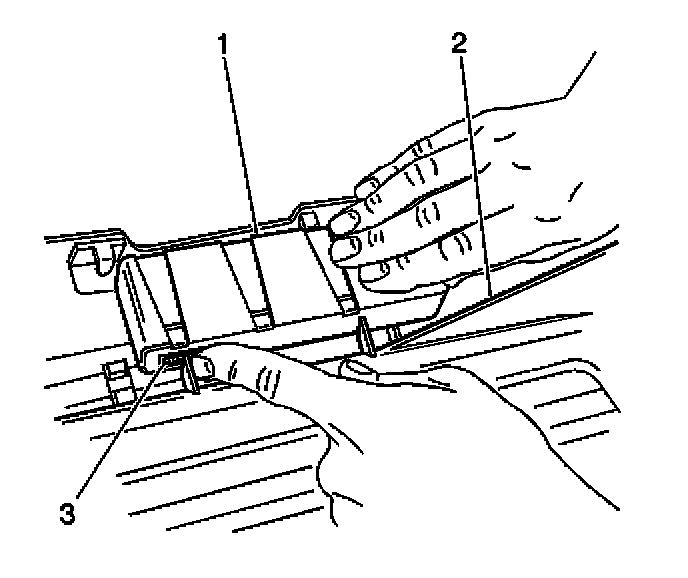 7. Reach inward between the headliner and roof panel in order to release the sunroof control module clip (3) securing the control module (1) to the sunroof module assembly (2).