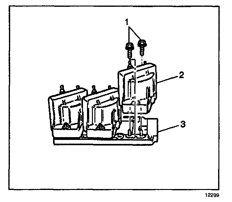 1. Attach the coils (2) and the ignition control module (3) to the bracket.
