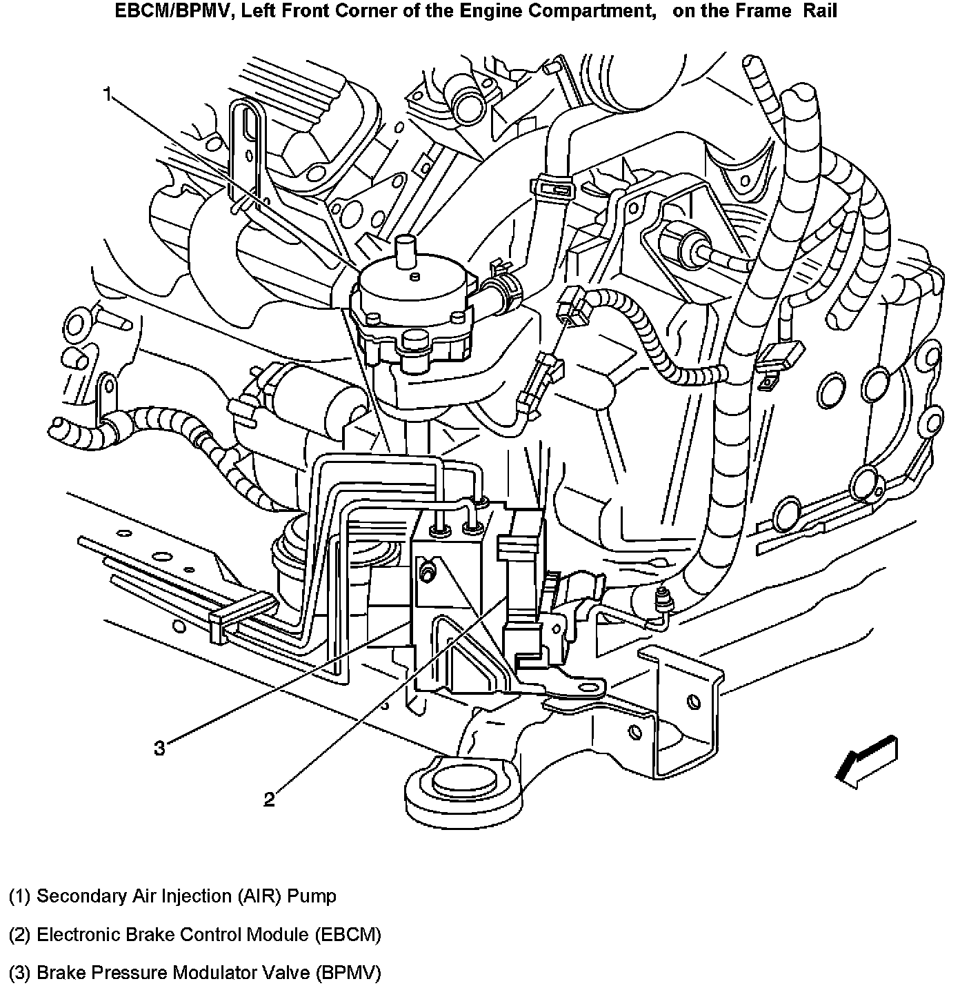 EBCM/BPMV, Left Front Corner Of The Engine Compartment, On The Frame Rail: